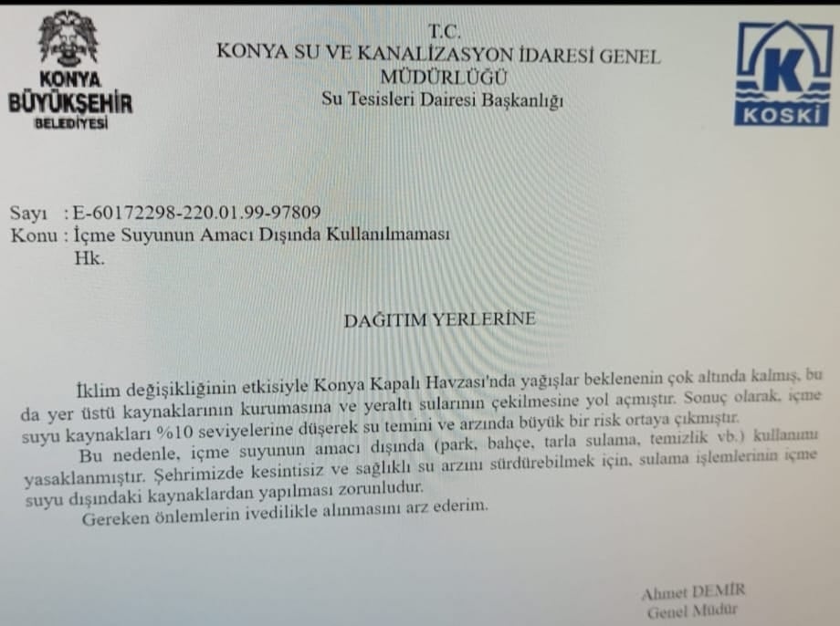 “İklim değişikliğinin etkisiyle Konya Kapalı Havzası’nda yağışlar beklenenin çok altında kalmış, bu da yer üstü kaynaklarının kurumasına ve yeraltı sularının çekilmesine yol açmıştır. Sonuç olarak, içme suyu kaynakları %10 seviyelerine düşerek su temini ve arzında büyük bir risk ortaya çıkmıştır. Bu nedenle, içme suyunun amacı dışında (park, bahçe, tarla sulama, temizlik vb.) kullanımı yasaklanmıştır. Şehrimizde kesintisiz ve sağlıklı su arzını sürdürebilmek için, sulama işlemlerinin içme suyu dışındaki kaynaklardan yapılması zorunludur. Gereken önlemlerin ivedilikle alınmasını arz ederim.”