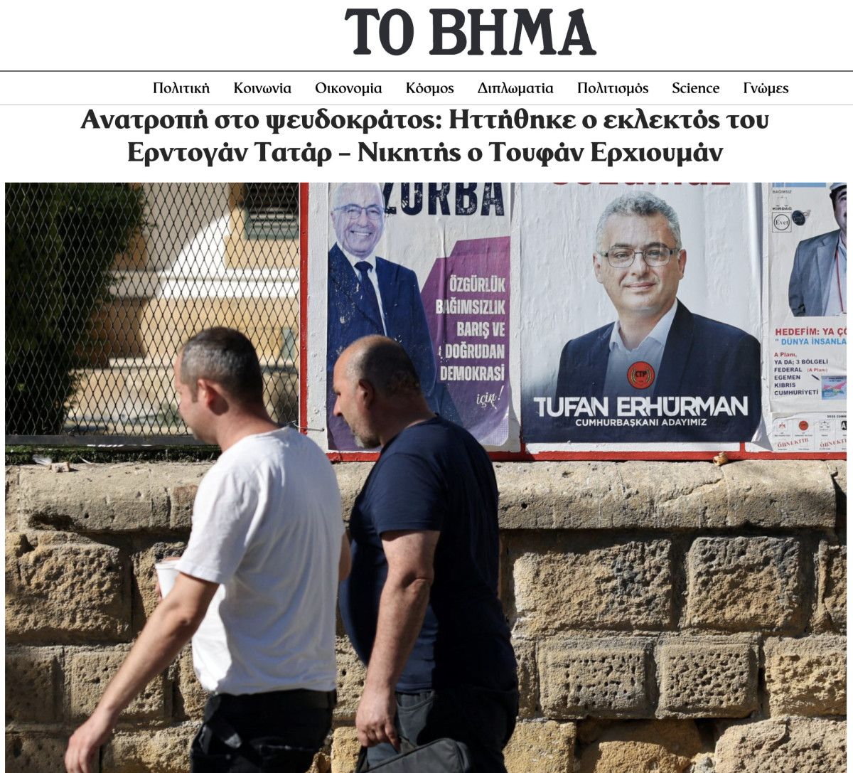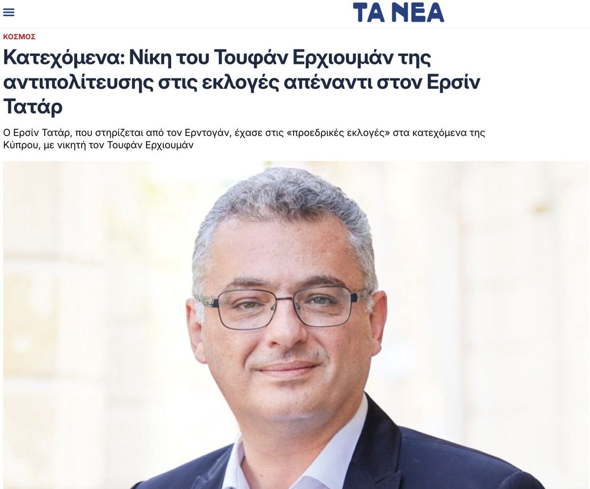 Ta Nea gazetesi ise manşetten verdiği haberde, “Yüksek Seçim Kurulu’nun verilerine göre, Türkiye Cumhurbaşkanı Tayyip Erdoğan’ın desteğini arkasına alan Kıbrıs Türk Lideri Ersin Tatar, işgal altındaki Kuzey Kıbrıs’ta yapılan ‘cumhurbaşkanlığı seçimlerinde’ yenilgiye uğradı” ifadelerine yer verdi.