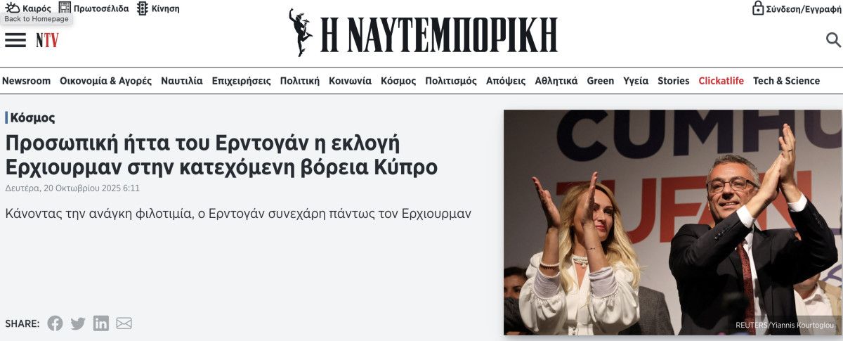 Ülkenin önde gelen finans gazetesi Naftemporiki ise “Erhürman’ın işgal altındaki Kuzey Kıbrıs’ta seçilmesi Erdoğan için kişisel bir yenilgidir” ifadelerine yer verdi.