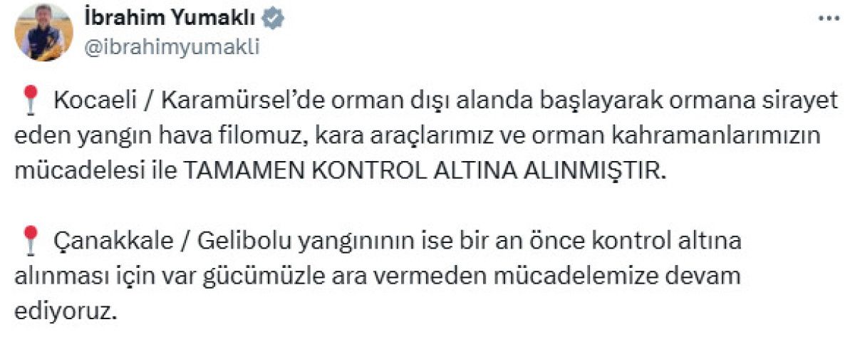 Bakan Yumaklı, Kocaeli’deki yangının bugün tamamen kontrol altına alındığını duyurdu.