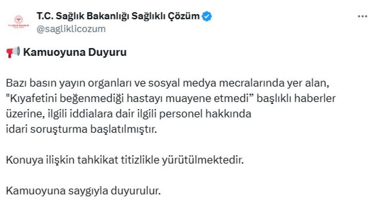 Bazı basın yayın organları ve sosyal medya mecralarında yer alan, “Kıyafetini beğenmediği hastayı muayene etmedi” başlıklı haberler üzerine, ilgili iddialara dair ilgili personel hakkında