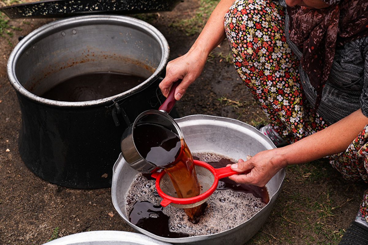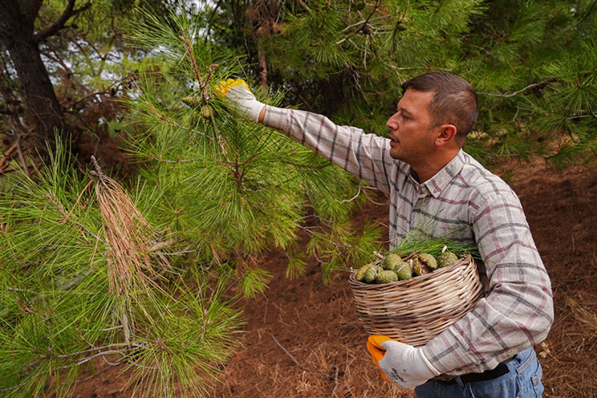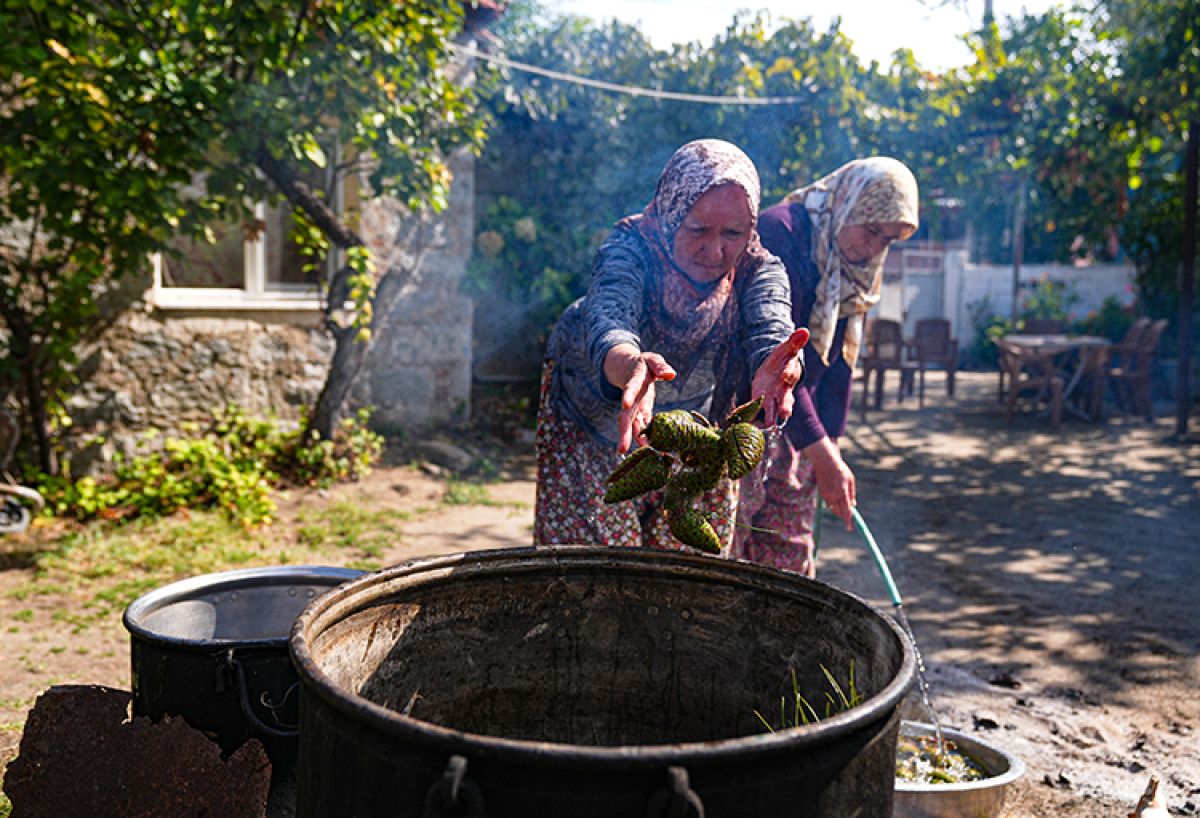 Kozak Yaylası’nın bereketli doğasında yaşayan kadınlar, her yıl mayıs ayından itibaren taze kızılçam kozalaklarını toplayarak imece geleneğini sürdürüyor. Keser yardımıyla ikiye bölünen kozalaklar, evlerin bahçelerinde yıkanıp bakır kazanlara alınarak odun ateşinde kaynatılıyor.