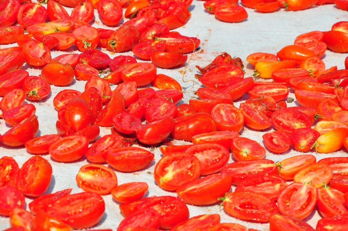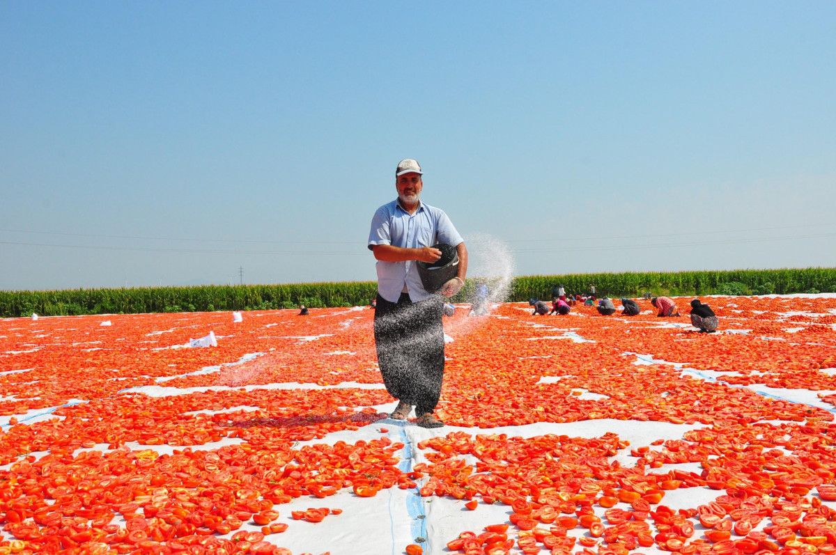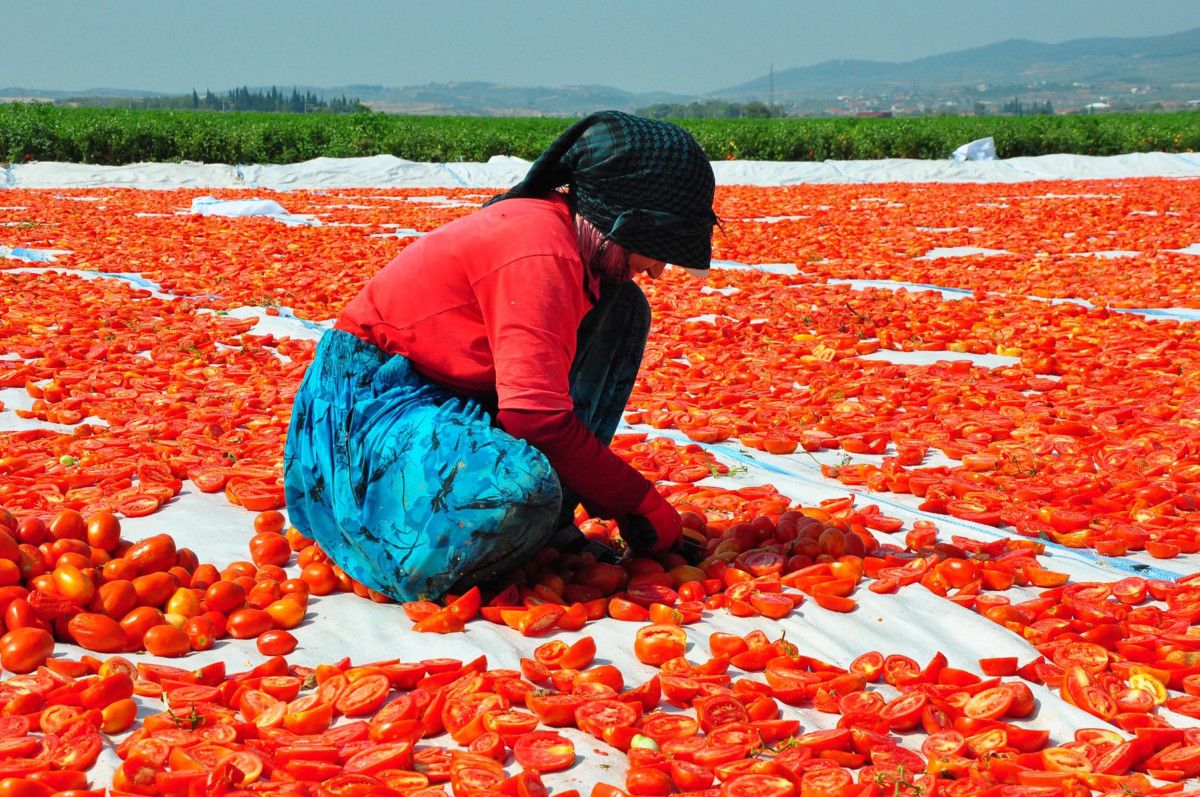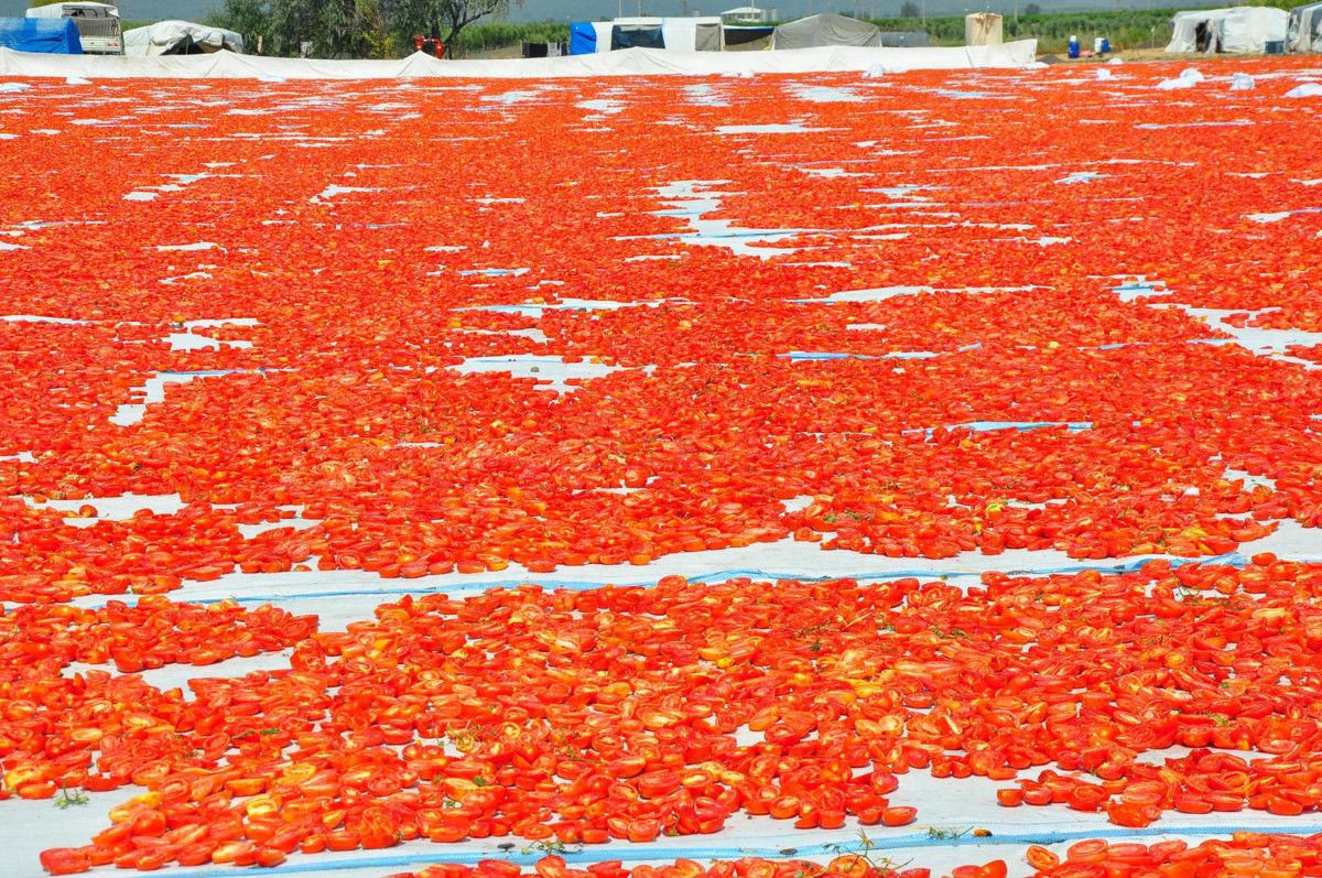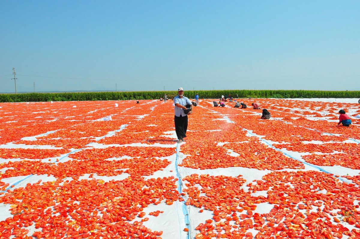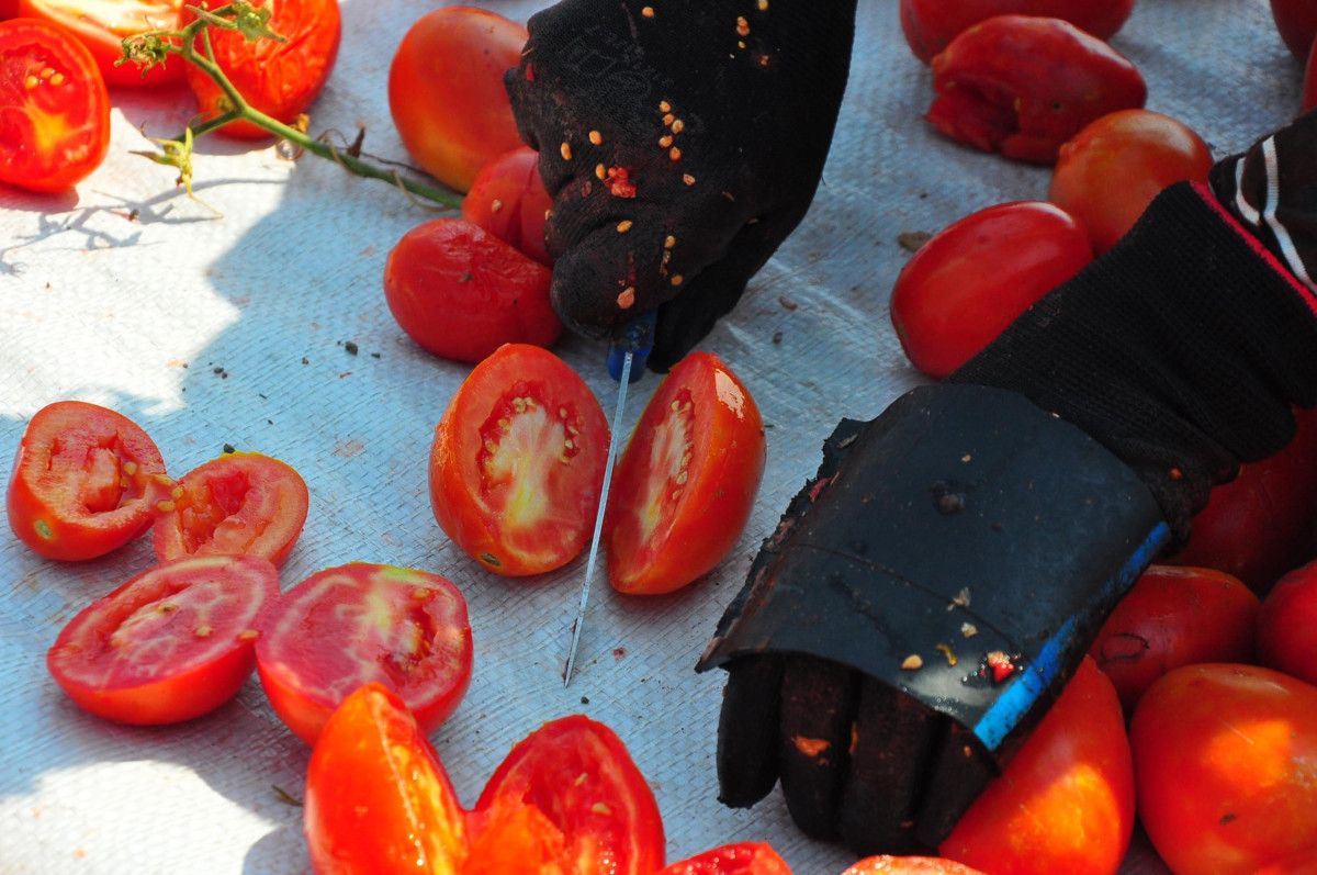 Kadın işçiler tarafından taze bir şekilde toplanarak kasalara doldurulan domatesler, getirildiği sergi alanlarında kesilerek, kurutulmaya bırakılıyor.