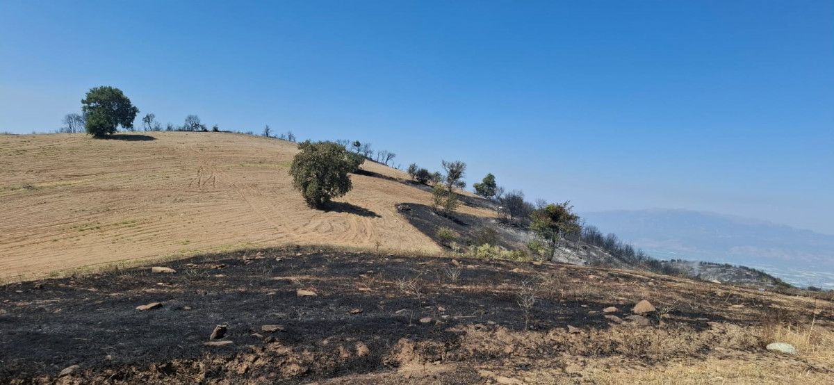 Büyük bir yıkıma yol açan yangından geriye küle dönen evler ve tarlalar kaldı.