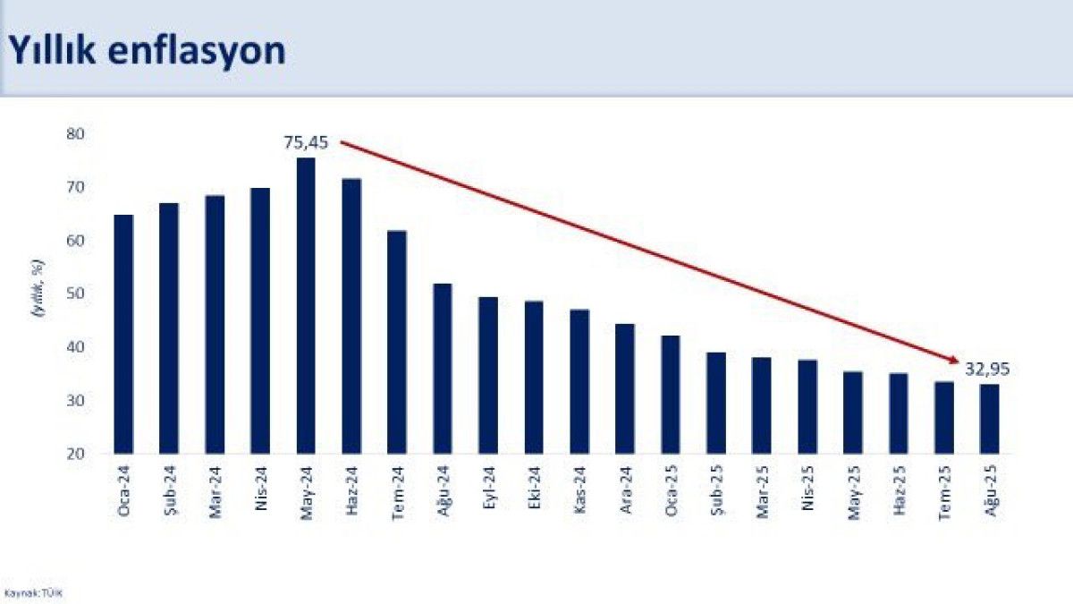 Türkiye İstatistik Kurumu verilerine göre enflasyon, ağustosta aylık 2,04 olurken yıllık enflasyon yüzde 32,95’e geriledi.