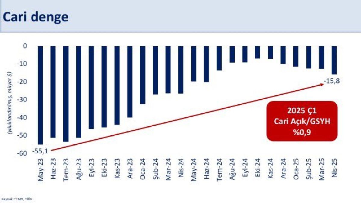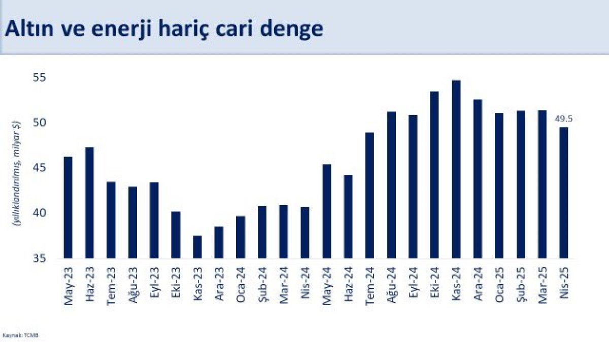 Nisan ayında yıllık cari açık öngörülerimiz doğrultusunda artış gösterse de programın başlangıcına göre 39,3 milyar dolar azaldı. Altın ve enerji hariç yıllık cari fazla ise 49,5 milyar dolar oldu. Küresel mal ticaretine ilişkin belirsizliklerin yoğunlaştığı bu dönemde hizmet ihracatındaki güçlü performansımız cari dengeyi destekliyor.