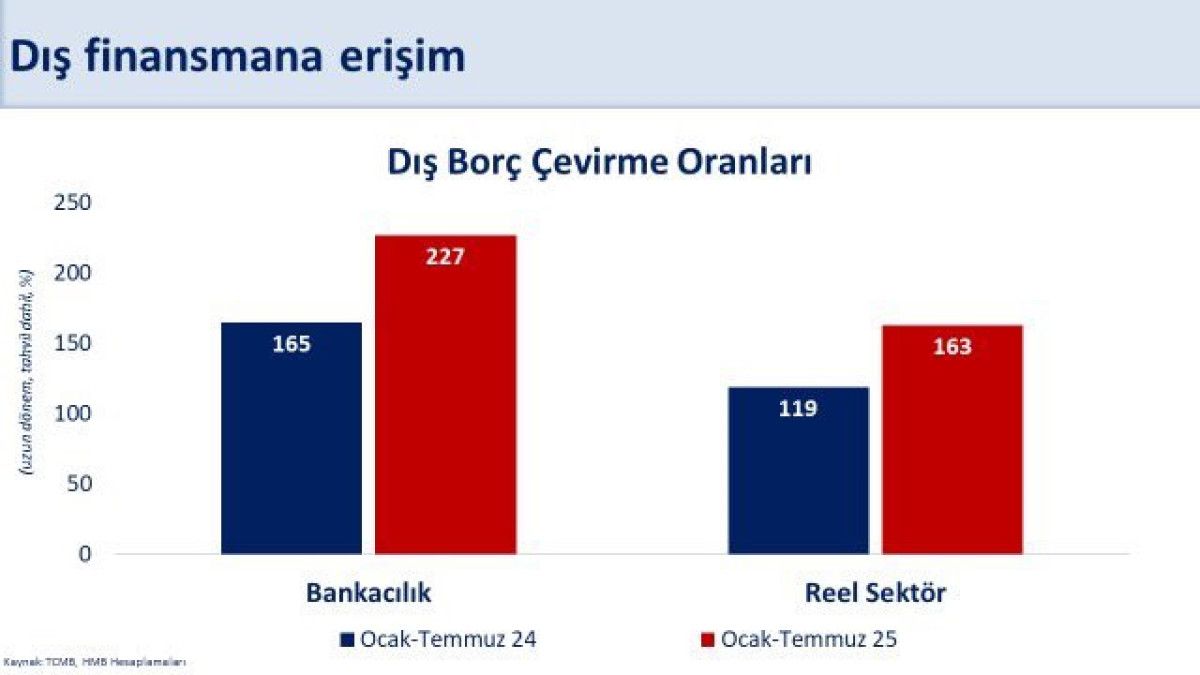 Şimşek yılın 7 ayında reel sektörün ve bankaların dış borç çevirme oranlarının sırasıyla yüzde 163 ve yüzde 227 seviyesinde gerçekleştiğine dikkati çekerek, şunları kaydetti: