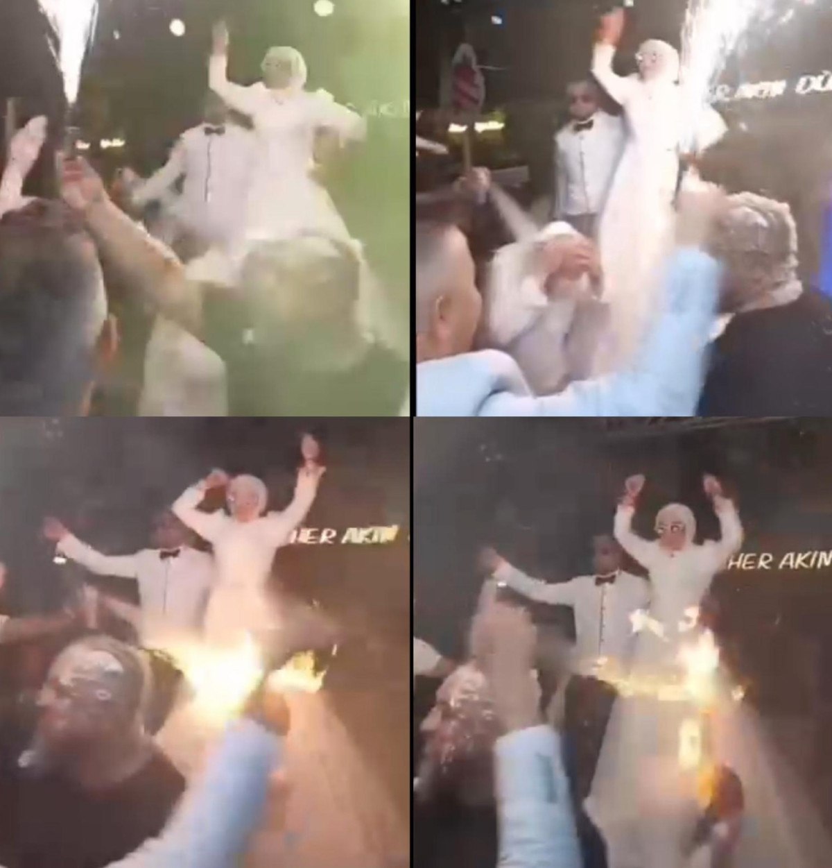 Gelin ve damat pistte dans ederken düzenlenen köpüklü ve meşaleli eğlence sırasında konuklardan birinin başına istenmeyen bir olay geldi.