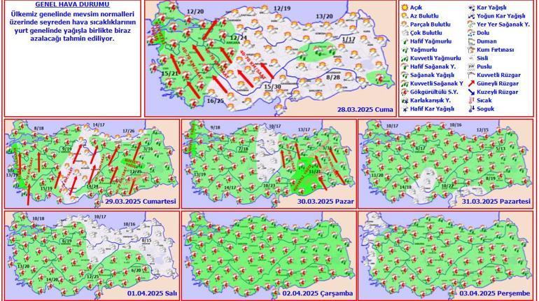 Yağışlar tüm yurdu etkisi altına alacak. Ege, Marmara, Karadeniz, İç Anadolu ve Doğu Anadolu genelinde sağanak ve gök gürültülü sağanak yağışlar görülecek. Orta ve Doğu Karadeniz’de yağışların yer yer kuvvetli olabileceği görülüyor. Doğu Anadolu’da bazı kesimlerde karla karışık yağmur ihtimali mevcut. Genel olarak sıcaklıklar düşüyor ve serin, yağışlı bir hava hakim olacak.