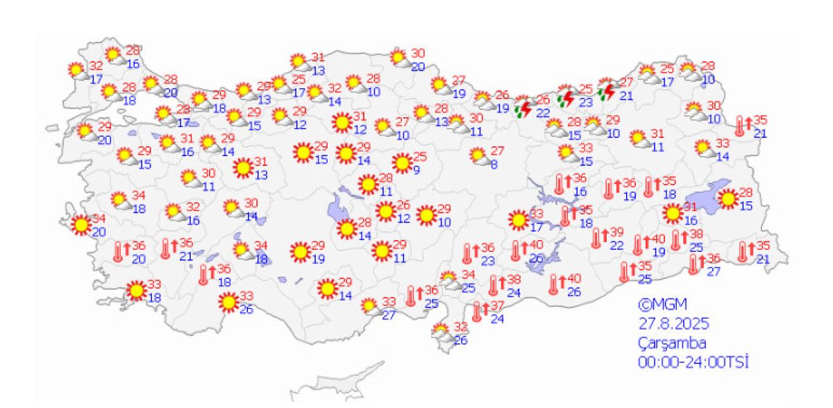 Ülkenin güney bölgelerinde ise sıcak hava etkisini sürdürüyor. Ege ve Akdeniz‘de termometreler hala yüksek seviyelerde seyredecek. İzmir’de 35-37 derece, Antalya, Mersin ve Adana’da ise gündüz 34-35 derece civarında olacak. Güneydoğu Anadolu‘da ise sıcaklıklar 40 derecenin üzerinde kalmaya devam edecek.
