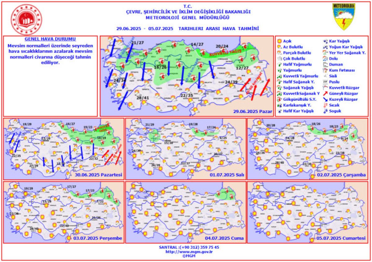 Rüzgarın genellikle kuzey yönlerden hafif, ara sıra orta kuvvette, Marmara, Ege ve İç Anadolu ile Doğu Anadolu’nun batısında kuzeyli, Doğu Anadolu’nun güneydoğusunda güneyli yönlerden kuvvetli ve yer yer kısa süreli fırtına (40-70 km/saat) şeklinde eseceği tahmin ediliyor.