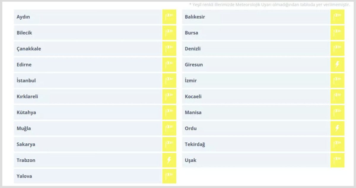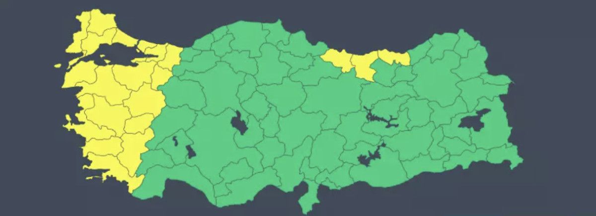 Kuvvetli rüzgar beklenen Aydın, Balıkesir, Bilecik, Bursa, Çanakkale, Denizli, Edirne, İstanbul, İzmir, Kırklareli, Kocaeli, Kütahya, Manisa, Muğla, Sakarya, Tekirdağ, Uşak, Yalova, kuvvetli yağış beklenen Giresun, Ordu ve Trabzon için “sarı” kodlu uyarıda bulunuldu.
