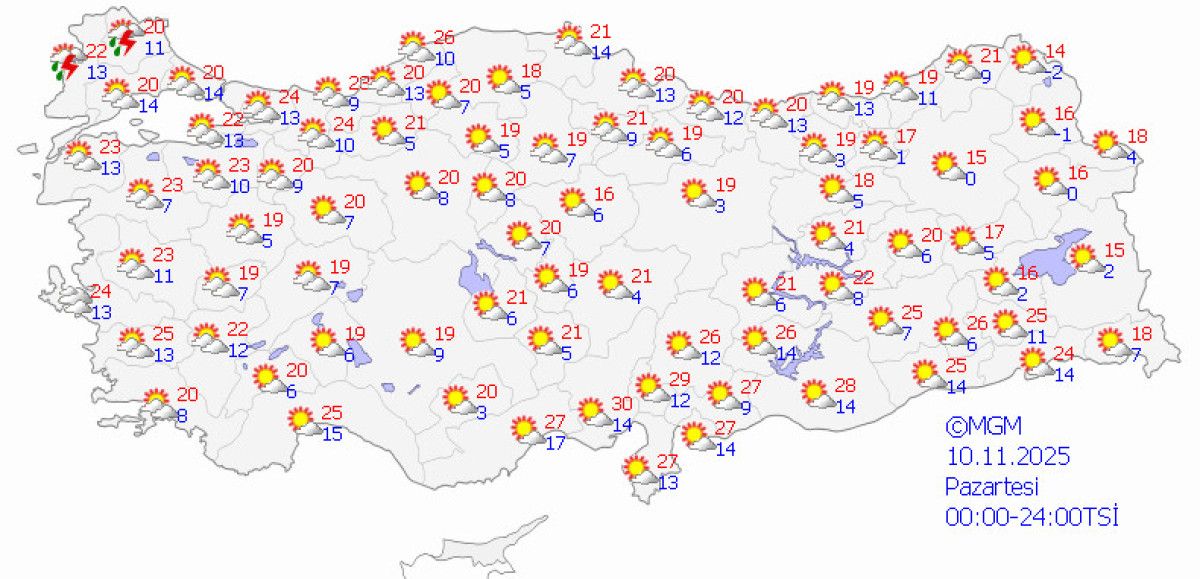 Meteoroloji verilerine göre; Marmara’nın batısı, İç Ege, Batı Akdeniz, İç Anadolu’nun batısında sağanak ve gök gürültülü sağanak yağış etkili olacak.