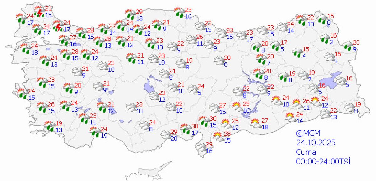 Meteoroloji tahminlere göre; yurt genelinin parçalı, yer yer çok bulutlu, Marmara, Ege, Batı Akdeniz, Doğu Akdeniz’in Toroslar mevkii, İç Anadolu’nun kuzeybatısı, Batı Karadeniz (Sinop hariç), Doğu Karadeniz, Doğu Anadolu (Hakkari hariç), Güneydoğu Anadolu’nun doğusu ile Osmaniye, Kahramanmaraş, Aksaray, Yozgat, Sivas, Ordu ve Tokat çevrelerinin yağmur ve sağanak, batı kesimlerin yer yer gök gürültülü sağanak, Doğu Karadeniz’in iç kesimlerinin yüksekleri ile Doğu Anadolu’nun kuzeydoğusunun yükseklerinin karla karışık yağmur ve yer yer kar yağışlı geçeceği tahmin ediliyor.