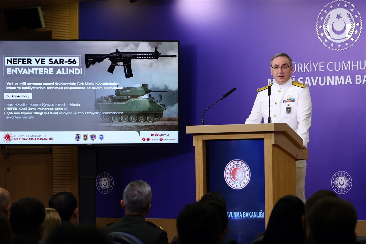 Tuğamiral Aktürk, yerli ve milli savunma sanayisi ürünleriyle TSK’nın imkan ve kabiliyetlerinin artırılması çalışmalarına da devam edildiğini belirterek, bu kapsamda Kara Kuvvetleri Komutanlığınca muhtelif miktarda, “NEFER Kuleli Zırhlı Muharebe Aracı” ile “5,56 milimetre Piyade Tüfeği’nin (SAR-56) muayene ve kabul faaliyetlerinin tamamlanarak envantere alındığını ifade etti.