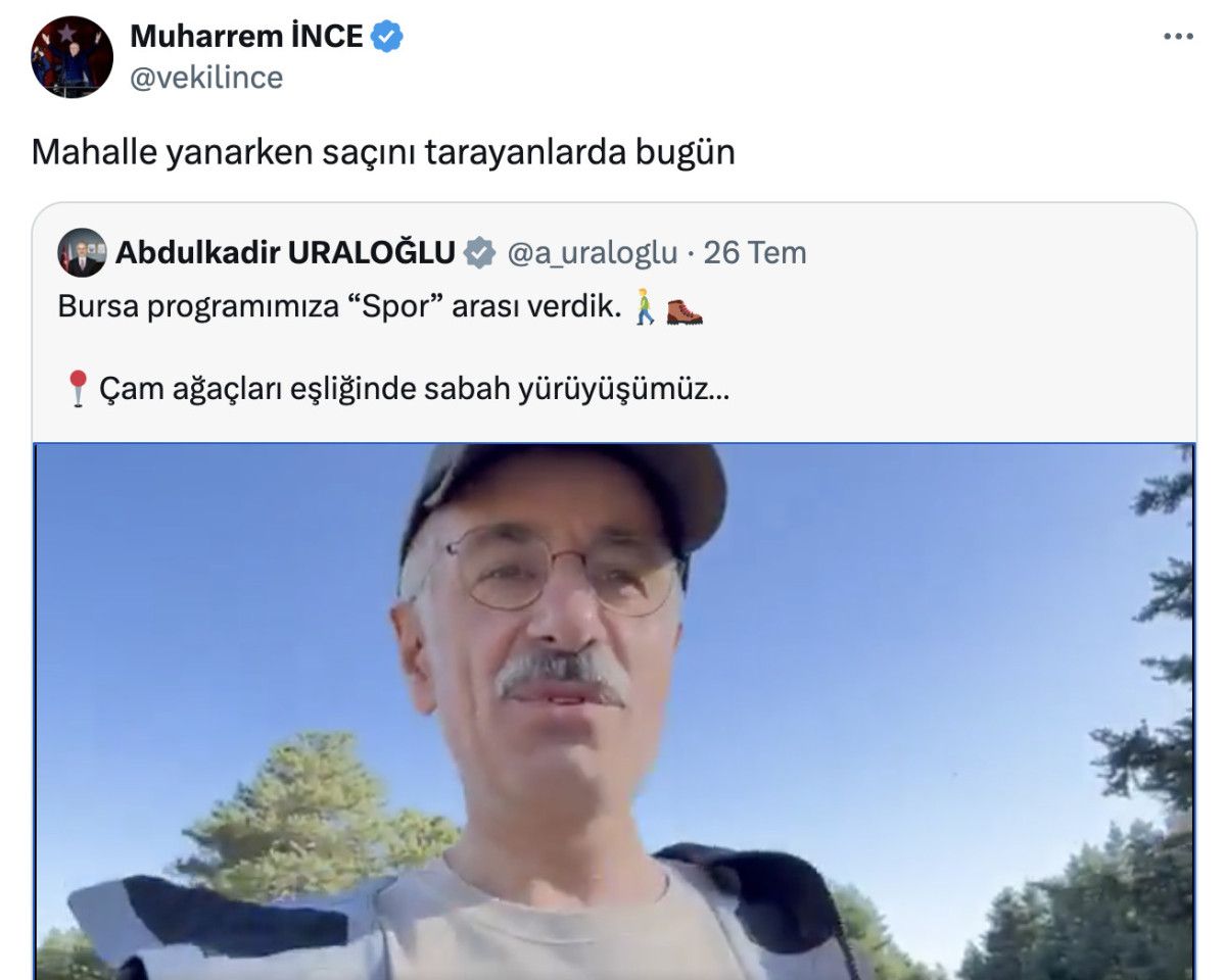 Bakan Uraloğlu’nun paylaşımını alıntılayan yeni CHP’li Muharrem İnce, “Mahalle yanarken saçını tarayanlarda bugün” ifadelerini kullandı.