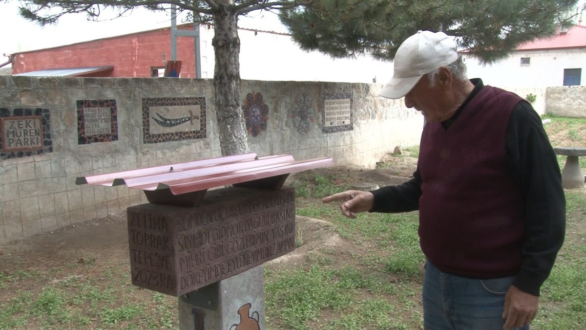 Eşinin anısına, evinin bahçesini şiirlerle donatarak bir anıt parka dönüştürdü.