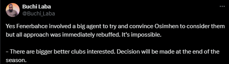 Resmi sosyal medya hesabından bir paylaşım yapan Buchi Laba, “Fenerbahçe, Victor Osimhen’i ikna etmek için büyük bir menajeri devreye soktu ancak tüm girişimler anında reddedildi. Bu transfer imkansız. Avrupa’nın büyük kulüpleri de Osimhen ile ilgileniyor ancak karar sezon sonunda verilecek.” dedi.