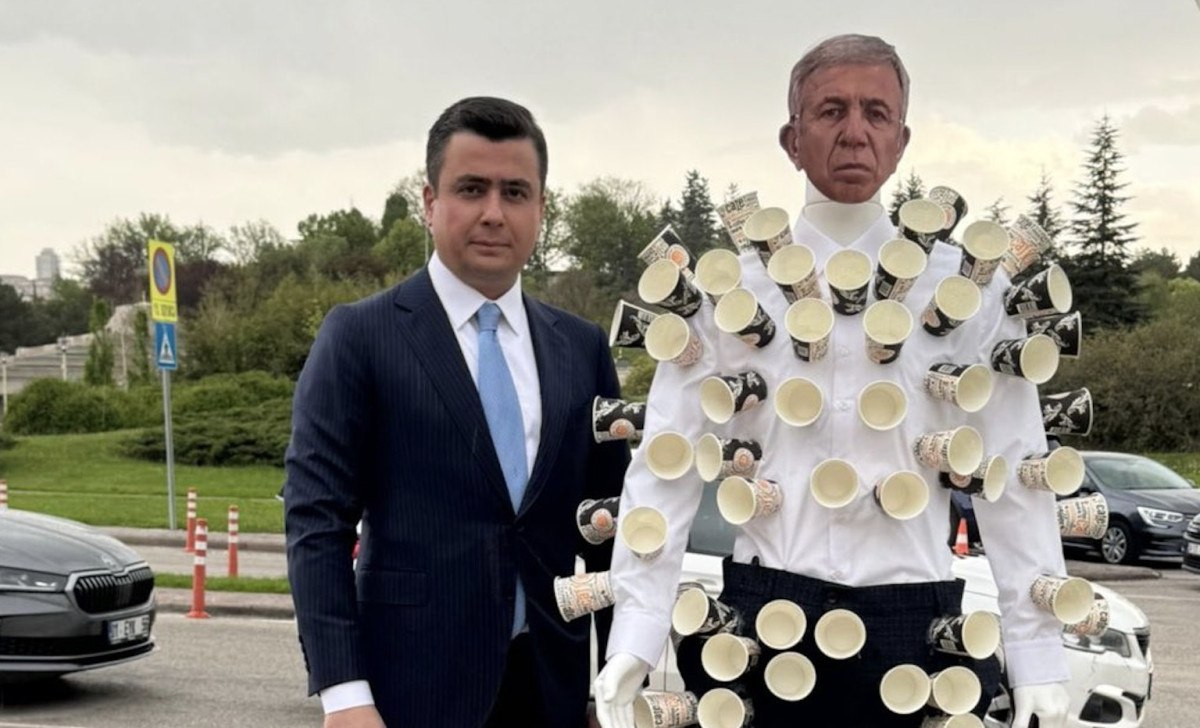 ABB yönetiminin kefen alımında yolsuzluğa karıştığını ortaya çıkardıktan sonra Meclis’e tabutla giriş yapan Vekil Gökçek, bu defa Mansur Yavaş maskesi takılmış cansız bir mankenle geldi.