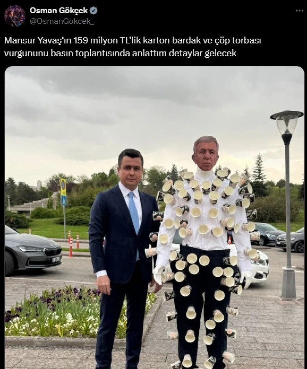 Cansız manken ile çekildiği fotoğrafı sosyal medya hesabından paylaşan Osman Gökçek, “Mansur Yavaş‘ın 159 milyon TL’lik karton bardak ve çöp torbası vurgununu basın toplantısında anlattım, detaylar gelecek.” ifadelerini kullandı.