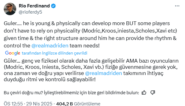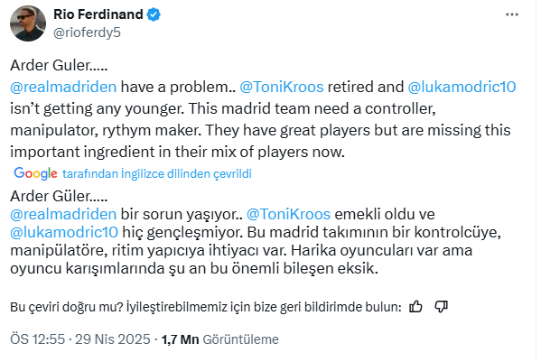 Bir zamanların en iyi defans oyuncularından biri olan İngiliz stoper Rio Ferdinand, sosyal medya hesabından Arda Güler için paylaşım yaptı. Rio Ferdinand, yetenekleri tartışılmayan milli futbolcumuz Arda Güler’in Real Madrid’de daha çok süre alması gerektiğini savundu. Sosyal medya hesabından paylaşım yapan Rio Ferdinand, “Real Madrid’in bir sorunu var. Toni Kroos emekli oldu ve Luka Modric artık eskisi kadar genç değil. Bu Madrid takımı, bir oyun kurucuya, tempoyu belirleyen bir oyuncuya ihtiyaç duyuyor. Harika oyuncuları var ama bu önemli öğe şu anki kadroda eksik. Arda Güler, genç ve fiziksel olarak gelişebilir ama bazı oyuncular fiziksel güce dayanmak zorunda değildir (Modric, Kroos, Iniesta, Scholes, Xavi gibi). Ona zaman ve etrafında doğru yapı verilirse, Real Madrid’in ihtiyaç duyduğu ritmi sağlayabilir ve oyunu kontrol edebilir!” ifadelerini kullandı.