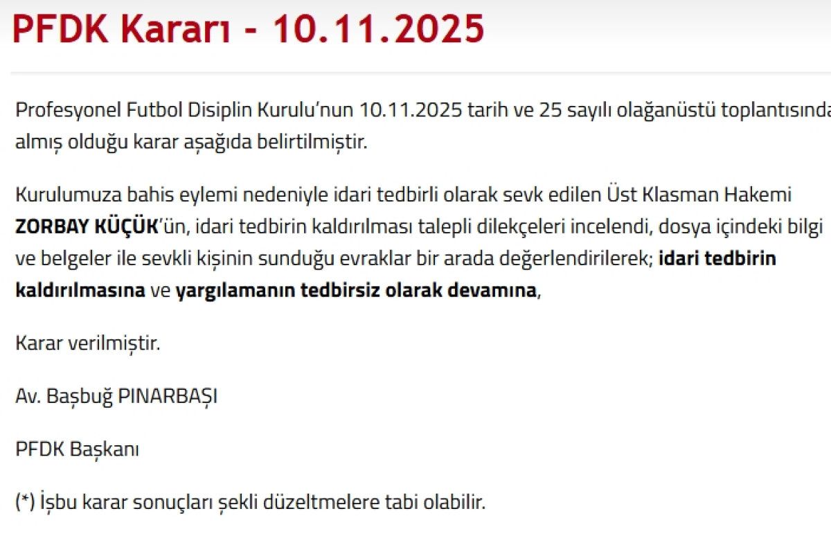 “Kurulumuza bahis eylemi nedeniyle idari tedbirli olarak sevk edilen Üst Klasman Hakemi ZORBAY KÜÇÜK’ün, idari tedbirin kaldırılması talepli dilekçeleri incelendi, dosya içindeki bilgi ve belgeler ile sevkli kişinin sunduğu evraklar bir arada değerlendirilerek; idari tedbirin kaldırılmasına ve yargılamanın tedbirsiz olarak devamına karar verilmiştir.”