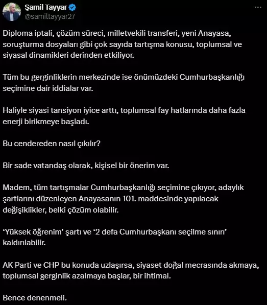 Kişisel önerisi olduğunu belirten Tayyar, Anayasa’nın 101. maddesinde yapılacak değişikliklerle ortaya çıkan gerilimin çözülebileceğini söyledi. Tayyar, “Anayasanın 101. maddesinde yapılacak değişiklikler, belki çözüm olabilir. Yüksek öğrenim şartı ve 2 defa Cumhurbaşkanı seçilme sınırı kaldırılabilir” ifadelerini kullandı.