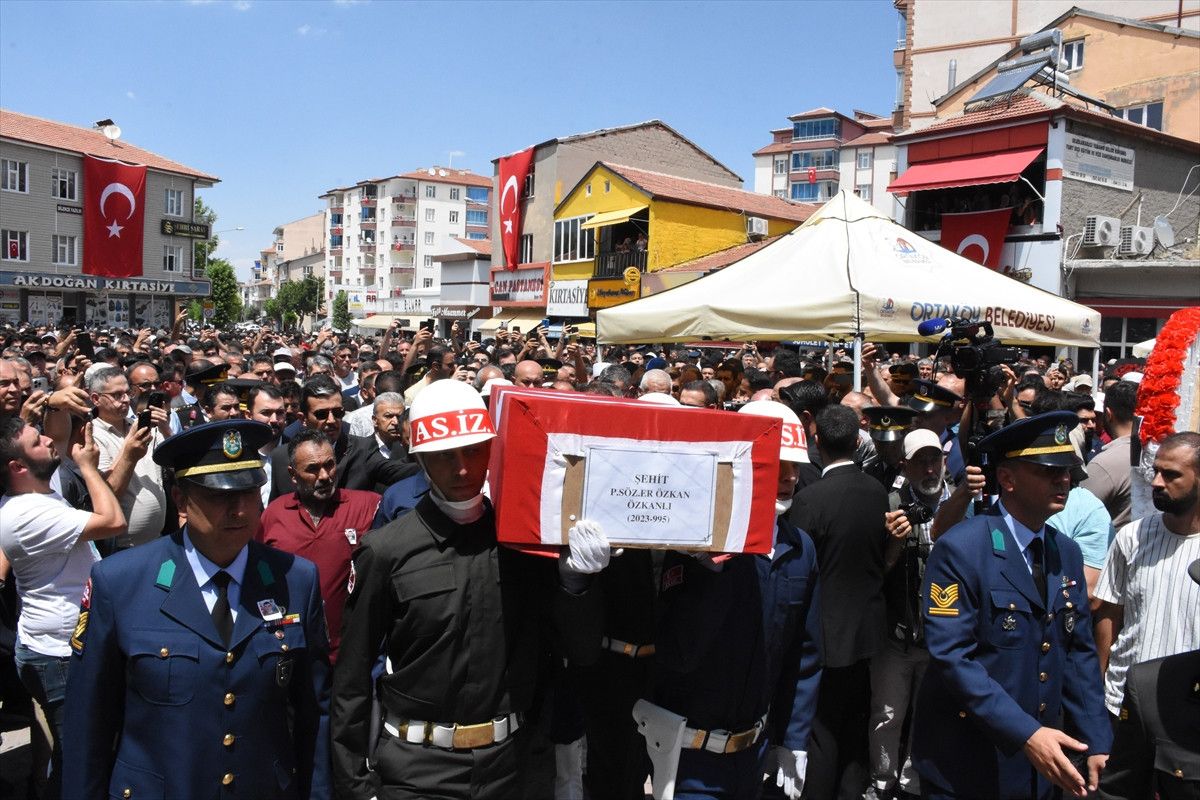 Pençe-Kilit Harekatı bölgesindeki mağarada arama tarama faaliyetinde metan gazından etkilenerek şehit olan askerlerden biri olan Piyade Sözleşmeli Er Özkan Özkanlı’nın Türk bayrağına sarılı naaşı, Ortaköy Devlet Hastanesi morgundan cenaze töreninin yapılacağı Ortaköy İlçe Meydanı’na getirildi.