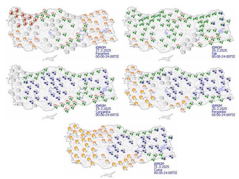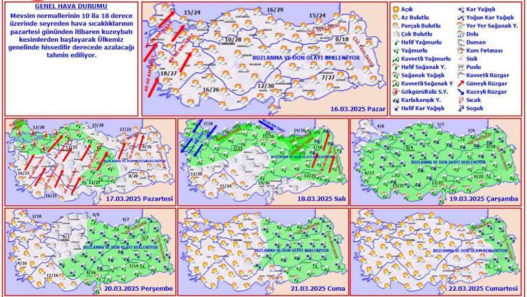 Öte yandan, sıcaklıkların Balkanlar üzerinden gelecek soğuk ve yağışlı havanın etkisiyle 18 Mart Salı gününden itibaren ülke genelinde 10 ila 15 derece azalarak mevsim normallerinin altına düşmesi bekleniyor.