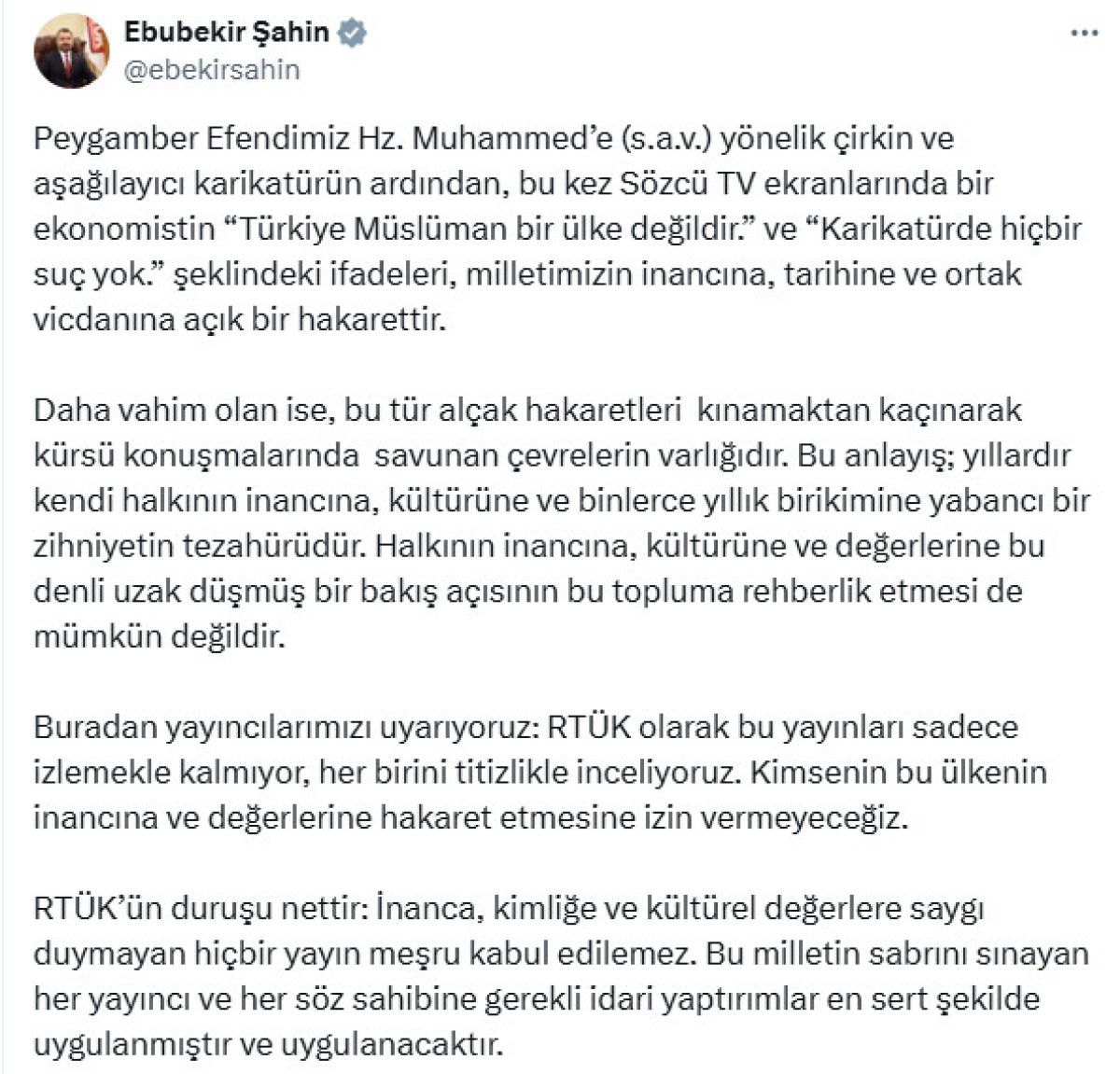 Peygamber Efendimiz Hazreti Muhammed’e yönelik çirkin ve aşağılayıcı karikatürün ardından, bu kez Sözcü TV ekranlarında bir ekonomistin ‘Türkiye Müslüman bir ülke değildir’ ve ‘Karikatürde hiçbir suç yok’ şeklindeki ifadeleri, milletimizin inancına, tarihine ve ortak vicdanına açık bir hakarettir.