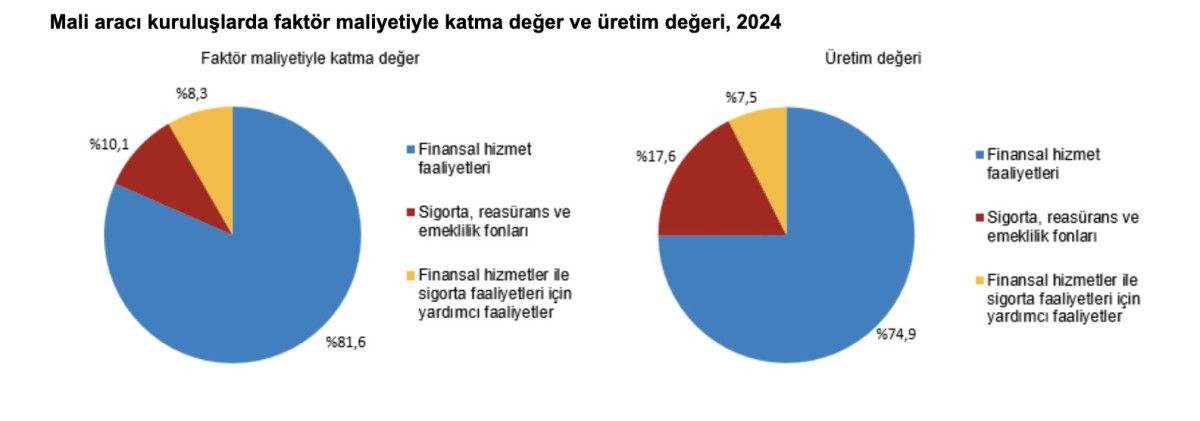 Üretim değerinin de yüzde 74,9’unu finansal hizmetler, yüzde 17,6’sını sigorta, reasürans ve emeklilik fonları, yüzde 7,5’ini finansal hizmetler ile sigorta faaliyetleri için yardımcı faaliyetler oluşturdu.