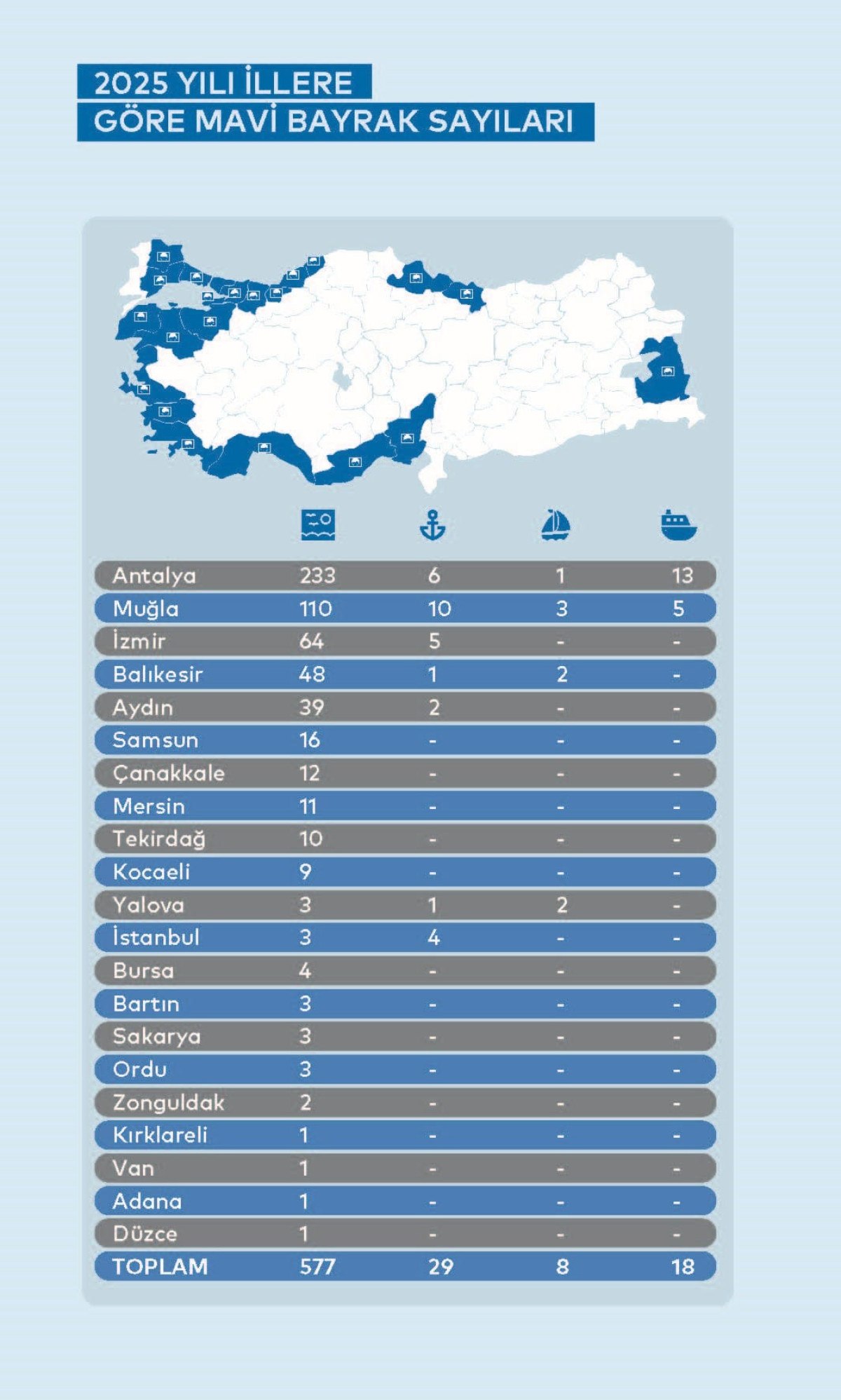 Marina kategorisinde en fazla bayrağa sahip iller, 10 marina ile Muğla, 6 marina ile Antalya ve 5 marina ile İzmir oldu.