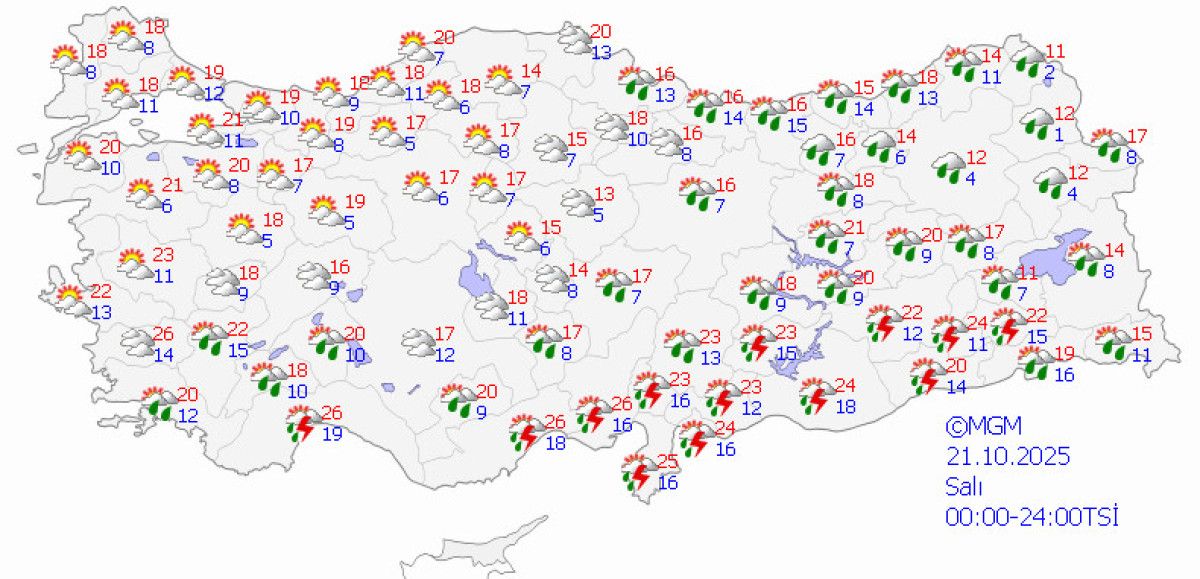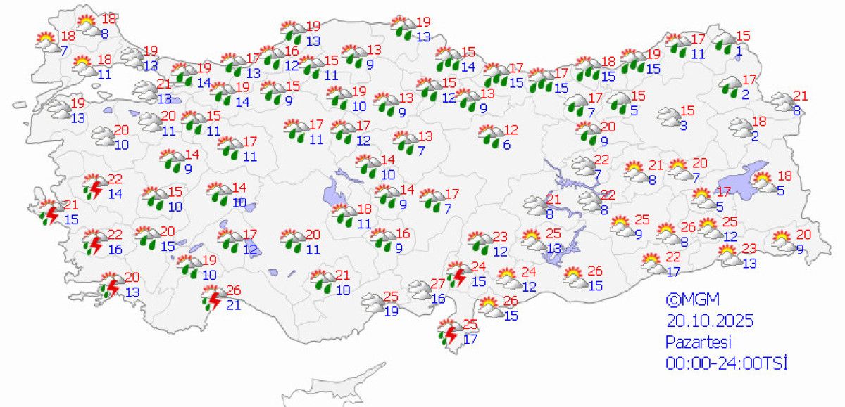 Meteoroloji Genel Müdürlüğü’nün (MGM) verilerine Türkiye genelinde hafta sonu başta olmak üzere havanın parçalı bulutlu ve yer yer yağışlı geçmesi bekleniyor.