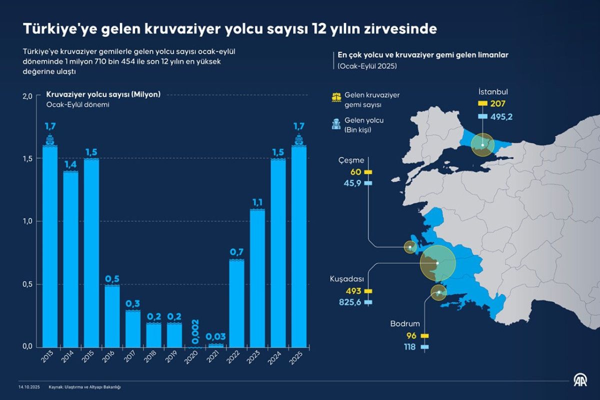 Ulaştırma ve Altyapı Bakanlığı Denizcilik Genel Müdürlüğü verilerine göre, Türkiye kruvaziyer turizminde önemli merkezlerden biri olmaya devam ediyor.