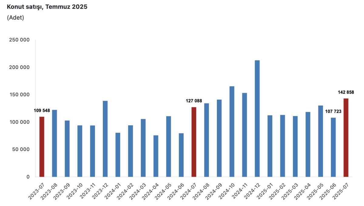 Türkiye genelinde konut satışları temmuz ayında bir önceki yılın aynı ayına göre yüzde 12,4 oranında artarak 142 bin 858 oldu.