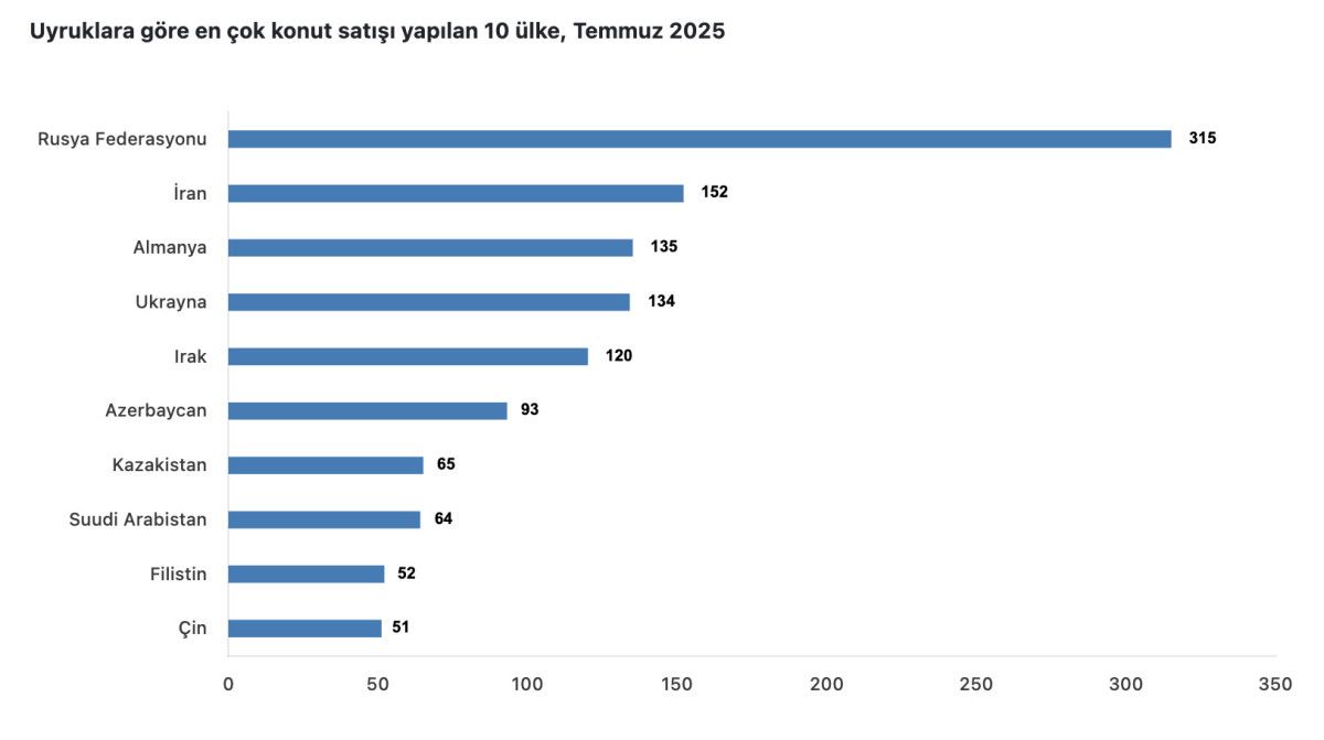 Temmuz ayında ülke uyruklarına göre en fazla konut satışı sırasıyla 315 ile Rusya Federasyonu, 152 ile İran ve 135 ile Almanya vatandaşlarına yapıldı.
