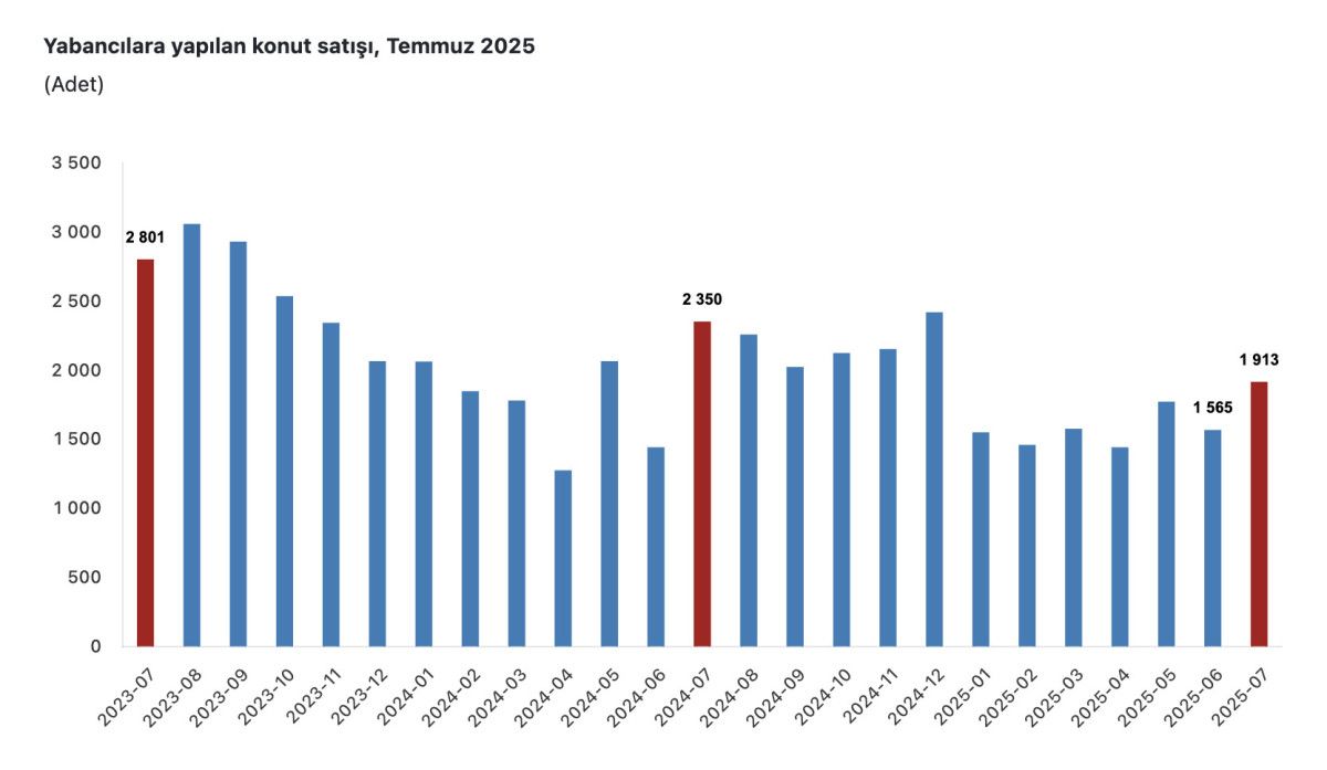 Yabancılara yapılan konut satışları Temmuz ayında bir önceki yılın aynı ayına göre yüzde 18,6 oranında azalarak bin 913 oldu. Temmuz ayında toplam konut satışları içinde yabancılara yapılan konut satışının payı yüzde 1,3 olarak gerçekleşti. Yabancılara yapılan konut satış sayısının en fazla olduğu iller sırasıyla 643 ile İstanbul, 642 ile Antalya ve 175 ile Mersin oldu.