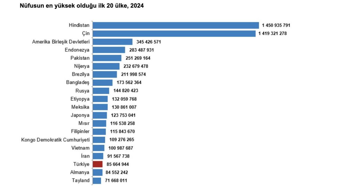 Türkiye, 85 milyon 664 bin 944 kişi nüfusu ile nüfus büyüklüğüne göre 194 ülke arasında 18. sırada yer alırken, dünya toplam nüfusunun yüzde 1,0’ını oluşturdu.