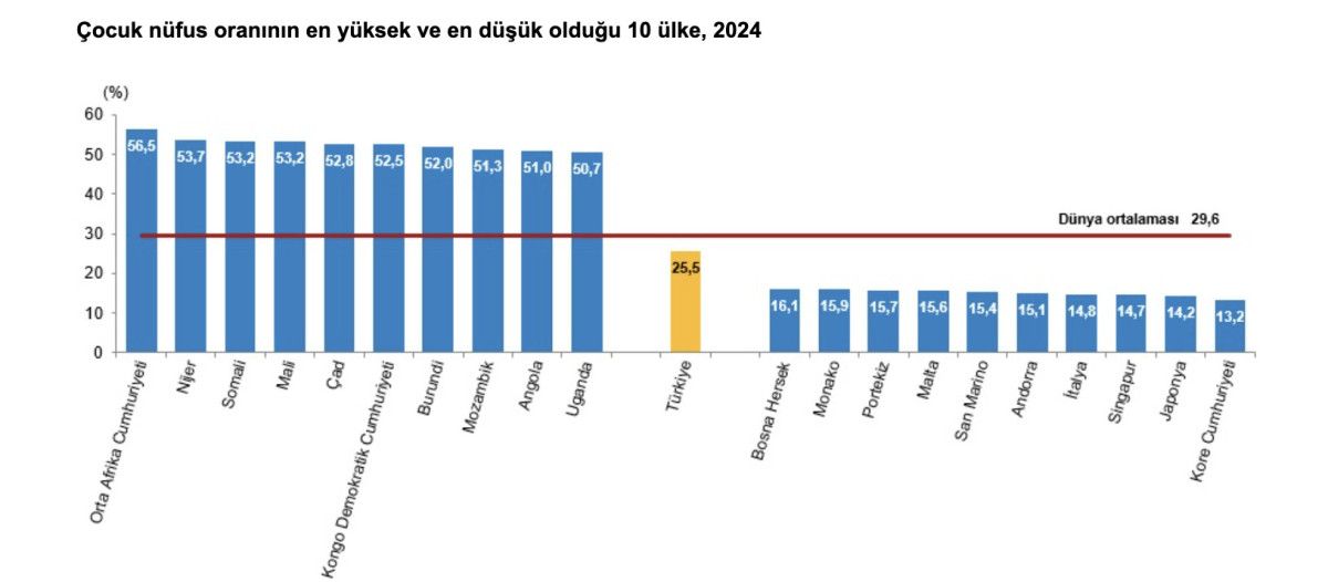 Çocuk nüfus oranı dünya ortalaması, 2024 yılında yüzde29,6 oldu. Türkiye’deki çocuk nüfus oranının yüzde25,5 ile dünya çocuk nüfus ortalamasının altında kaldığı görüldü.