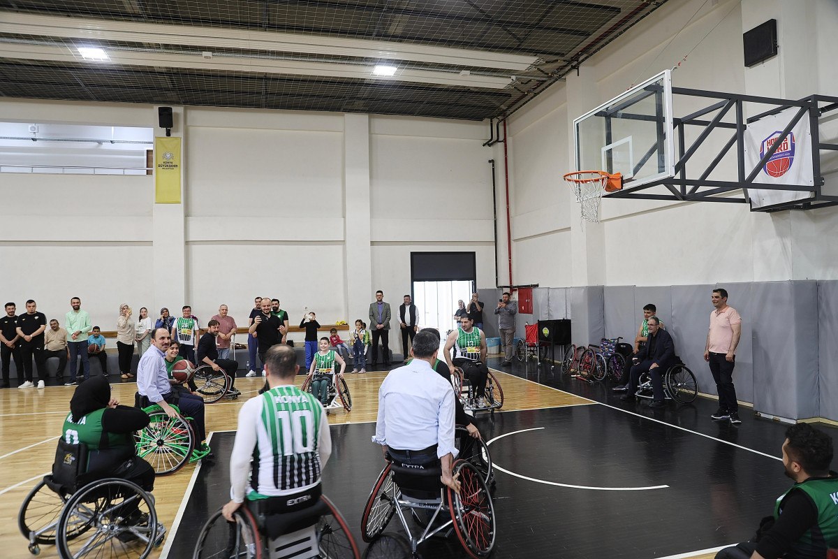Konya Büyükşehir Belediyesi tarafından Konya Lisesi’ne kazandırılan spor salonunda gerçekleştirilen etkinlikte Konya Büyükşehir Belediye Başkanı Uğur İbrahim Altay, tekerlekli sandalyeye oturarak Konya Engelliler Spor Kulübü Tekerlekli Sandalye Basketbol Takımı sporcularıyla ile maç yaptı.