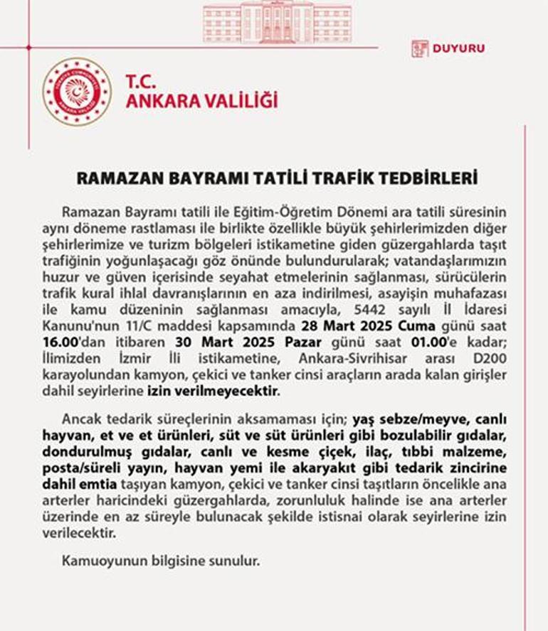 “28 Mart 2025 Cuma günü saat 16.00’dan itibaren 30 Mart 2025 Pazar günü saat 01.00’e kadar; ilimizden İzmir istikametine, Ankara-Sivrihisar arası D200 kara yolundan kamyon, çekici ve tanker cinsi araçların arada kalan girişler dahil seyirlerine izin verilmeyecektir”