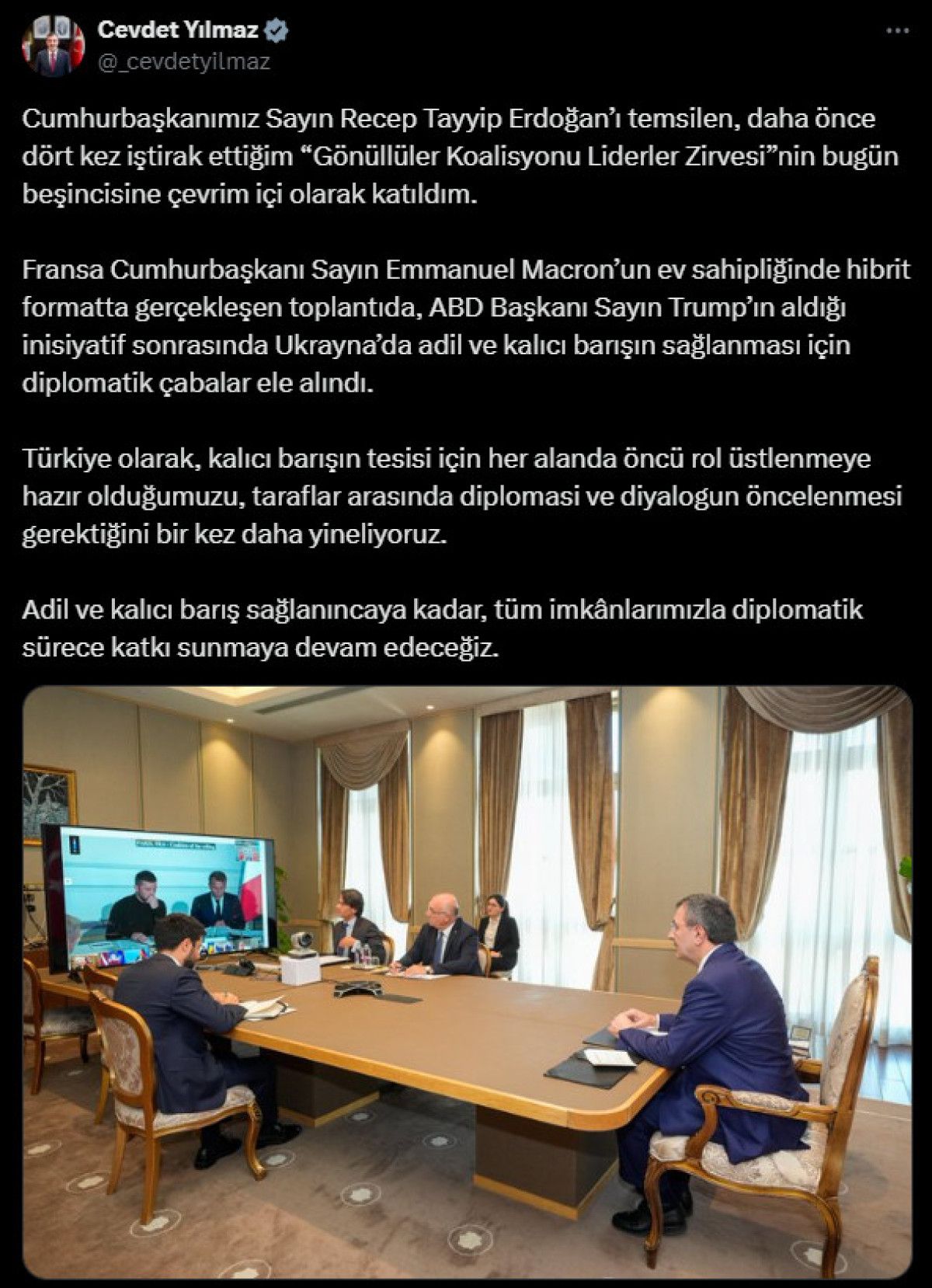 Fransa Cumhurbaşkanı Sayın Emmanuel Macron’un ev sahipliğinde hibrit formatta gerçekleşen toplantıda, ABD Başkanı Sayın Trump’ın aldığı inisiyatif sonrasında Ukrayna’da adil ve kalıcı barışın sağlanması için diplomatik çabalar ele alındı.