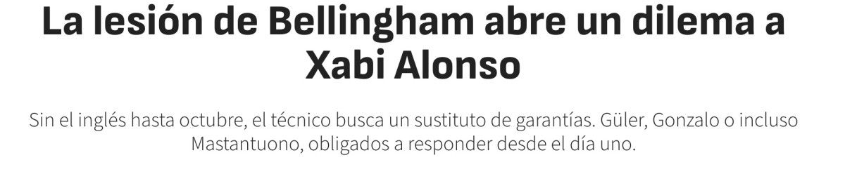 AS’ın derlediği haberde Jude Bellingham’ın yaşadığı sakatlık sonrası sahalardan 12 haftalık bir süre bandında uzak kalacağı ifade edilirken, Xabi Alonso’nun çözüm yollarından birinin Arda Güler’e çıktığı belirtildi.