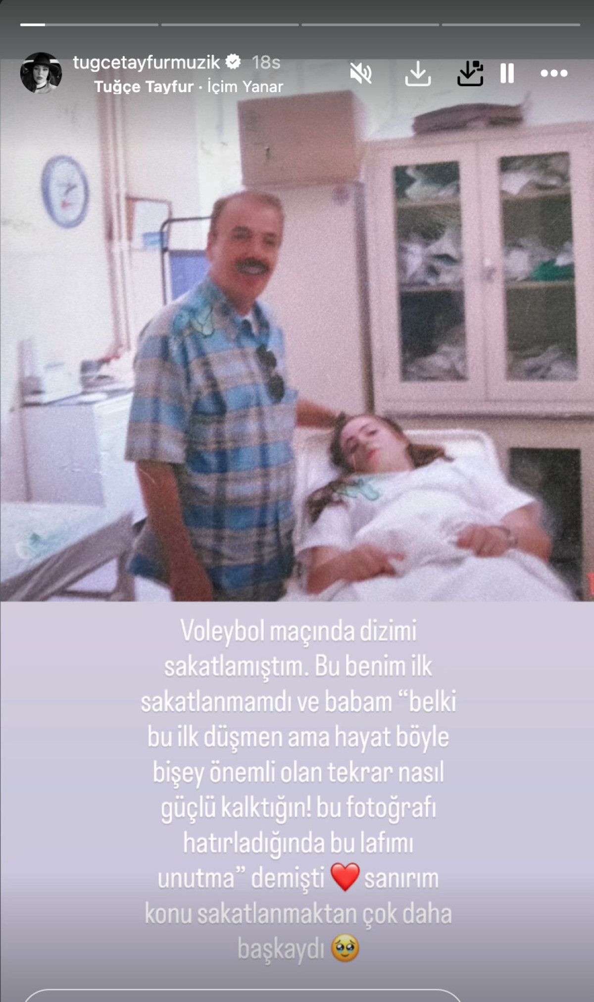 Aktif olarak kullandığı sosyal medya hesabından babasıyla seneler önce hastanede çektirdiği bir kareyi yayınlayan Tuğçe Tayfur, “Voleybol maçında dizimi sakatlamıştım. Bu benim ilk sakatlanmamdı ve babam “Belki bu ilk düşmen ama hayat böyle bir şey. Önemli olan tekrar nasıl güçlü kalktığın! ‘Bu fotoğrafı hatırladığında bu lafımı unutma’ demişti. Sanırım konu sakatlanmaktan çok daha başkaydı” ifadelerini kullandı