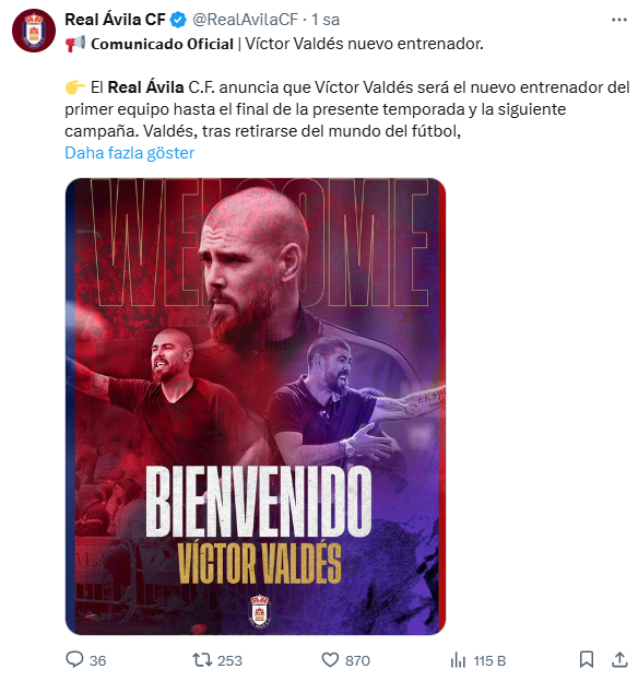 Valdes, İspanya 4. Lig ekibi Real Avila’nın yeni teknik direktörü oldu. 43 yaşındaki genç teknik adam, İspanyol ekibiyle 1.5 yıllık sözleşme imzaladı.