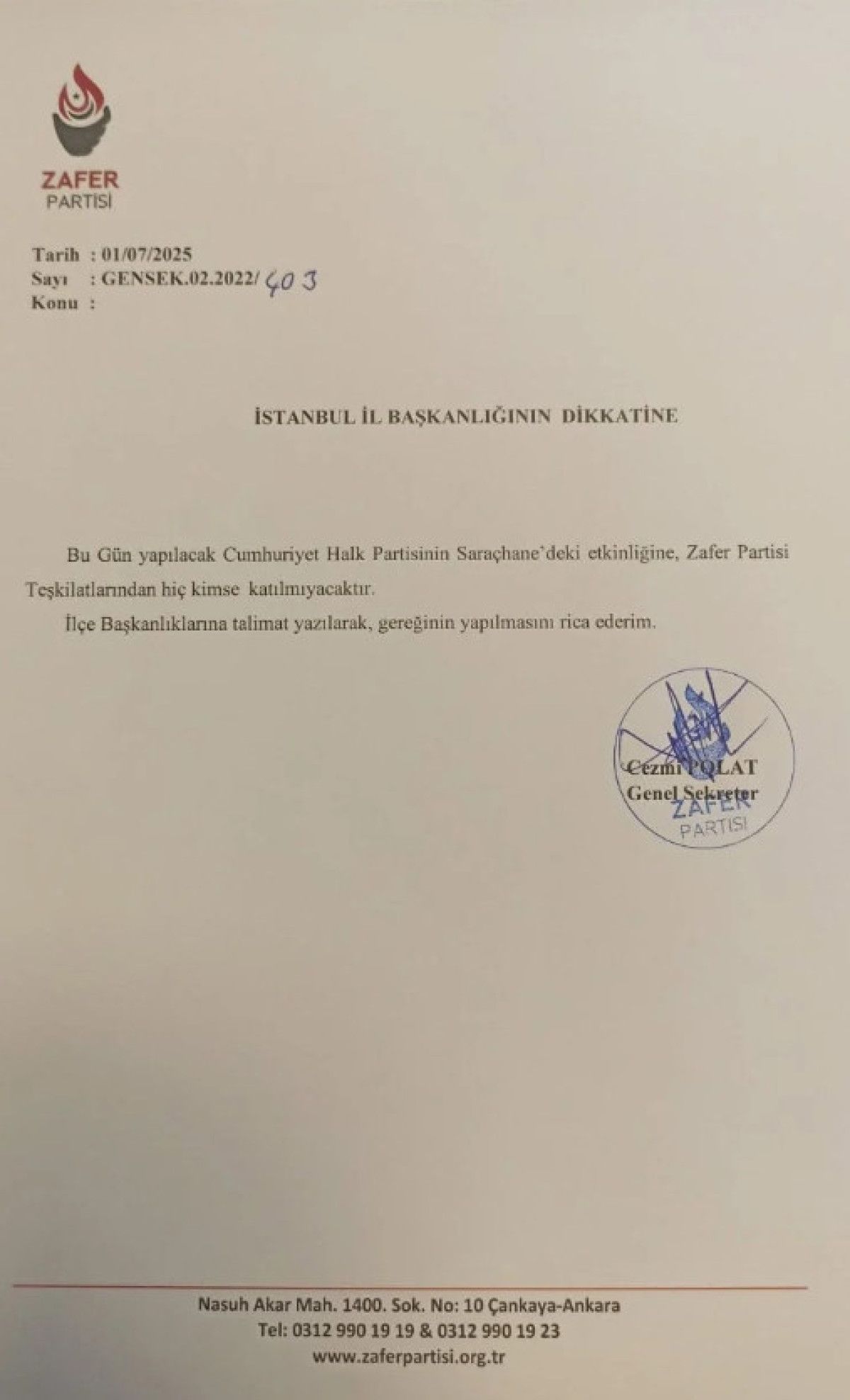 Zafer Partisi, İstanbul Teşkilatı’na yazı gönderdi.